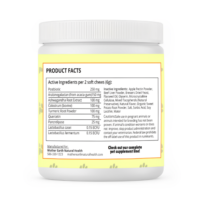 Holistic relief for itchy, irritated dogs. Mother Earth Pets - Canine Allergy Soft Chews deliver natural, chemical-free support to ease seasonal allergy discomfort. This carefully formulated blend combines Quercetin, Turmeric, Ashwagandha, Colostrum, and a potent probiotic mix to reduce itching, licking, and scratching while supporting immune and gut health. Ideal for dog parents seeking a clean, science-backed supplement to promote overall wellness during allergy season and beyond.