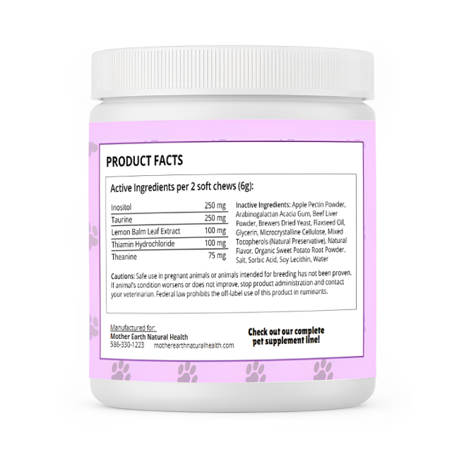 Natural stress and anxiety relief for dogs. Mother Earth Pets - Canine Calm Soft Chews offers a gentle, non-sedative formula designed to soothe stress, reduce hyperactivity, and promote emotional balance. Featuring Taurine, Inositol, Theanine, Thiamin, and Lemon Balm, this blend supports nervous system health and calm behavior. Ideal for dogs facing loud noises, travel, new environments, vet visits, or separation anxiety, these soft chews provide natural calming support for ingredient-conscious pet parents.