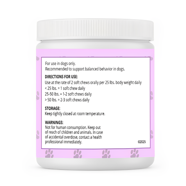 Promotes calm and balanced behavior without sedation by supporting brain and nervous system health. Helps dogs manage anxiety and overexcitement during stressful situations like loud noises, separation, travel, and training. Made with gentle, natural ingredients, this formula supports emotional regulation and everyday stress relief, providing peace of mind for pets and their owners.