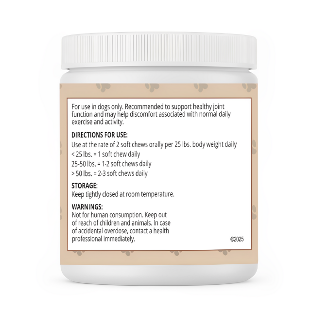 Joint support for every step of your dog’s journey. Mother Earth Pets - Canine Hip and Joint Soft Chews feature a potent natural blend designed to maintain skeletal health, flexibility, and comfortable movement. Formulated with MSM, Chondroitin, Glucosamine, Turmeric, Boswellia, Devil’s Claw, and Collagen, these soft chews help reduce inflammation and stiffness, promoting active, agile, and happy dogs at every age.
